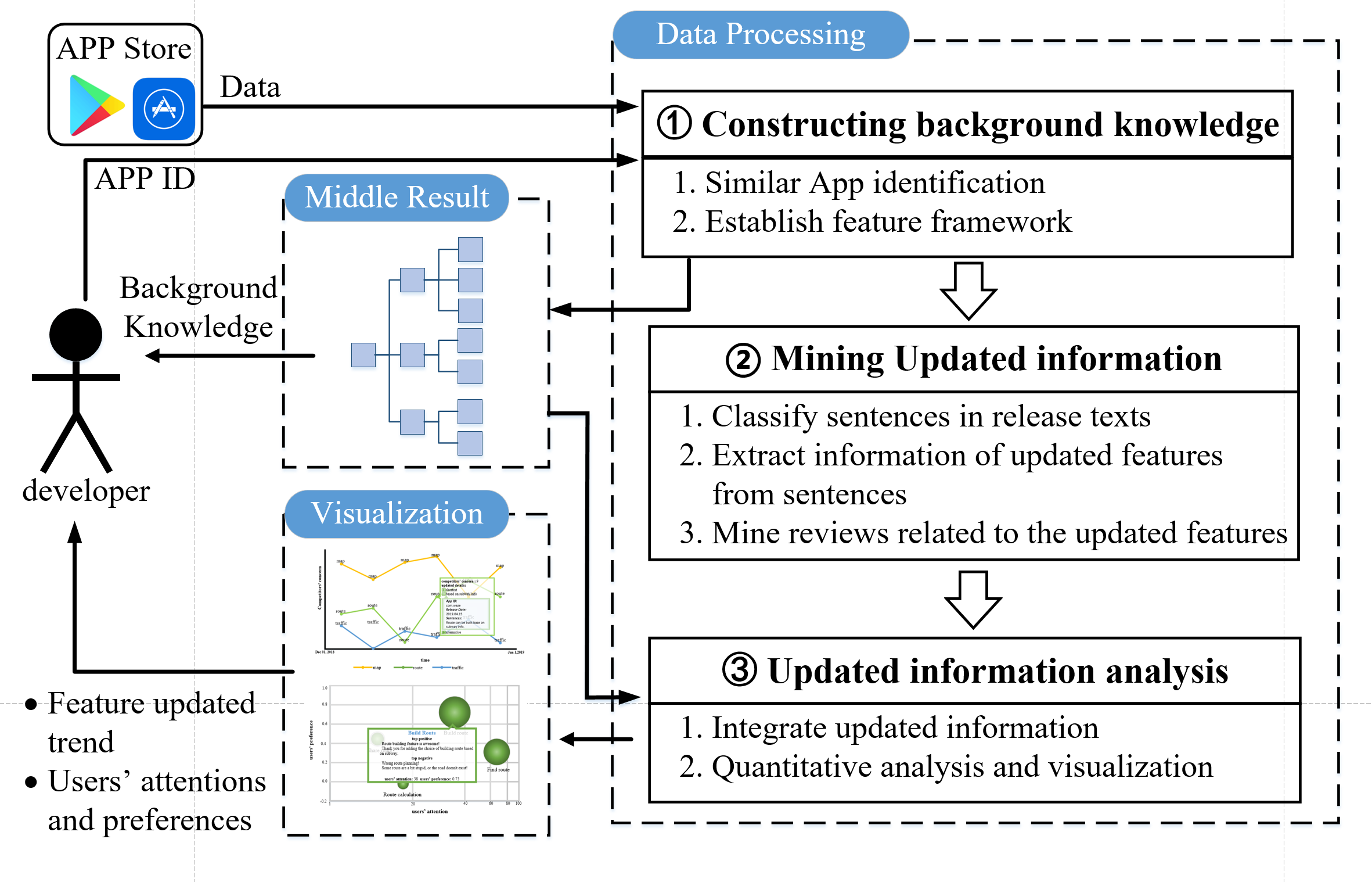 We propose an approach to analyze the data resources (App descriptions, release texts and reviews) in App stores for helping John make feature updating strategy of his product. The main process are as follow: